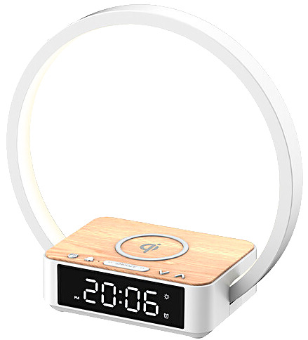 HERÄTYSVALO QI-lataus Wake-up Light -herätystoiminto – herää pehmeästi valaistuksen kirkastuessa 10 minuuttia ennen hälytystä. Digitaalinen herätyskello, jossa sisäänrakennettu langaton Qi-laturi puhelimelle ja kuulokkeille. Kolme valotilaa LED-renkaassa ja himmennettävä LCD-näyttö. Latausteho jopa 15 W – Qi-tuki iPhonelle ja Android-laitteille. 39-5007