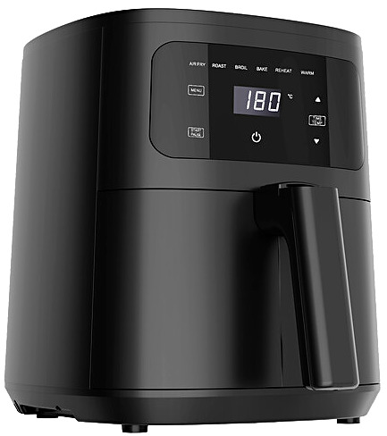 AIRFRYER 5.8L Friteeraa, paista uuniruokia tai leivo koko perheelle. Keraaminen pinnoite korissa ja pannussa – helppo puhdistaa. 6 esiasettua ohjelmaa – helpottaa vähärasvaista ja monipuolista ruoanlaittoa. Säädettävä lämpötila (80–200 °C) ja ajastin (0–60 minuuttia). 44-5359