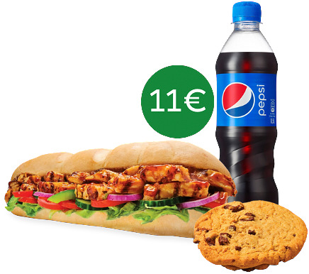 Kaikki 30 cm subiateriat 0,5 l pullojuomalla ja valinnan mukaan keksillä tai sipsipussilla.